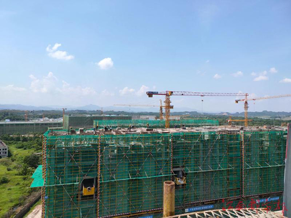 7月12日上午,在广信区城南新区的和兴家园安置小区项目施工现场,各类大型机械开足马力,一辆辆大卡车运着材料驶进施工场地,工人们马不停蹄地抢抓时间节点,高峰期,每天施工人员超500余人。